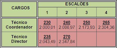 Esta segunda tabela corresponde aos índices, escalões e respectivo vencimento dos Técnicos Coordenadores e Técnicos Directores